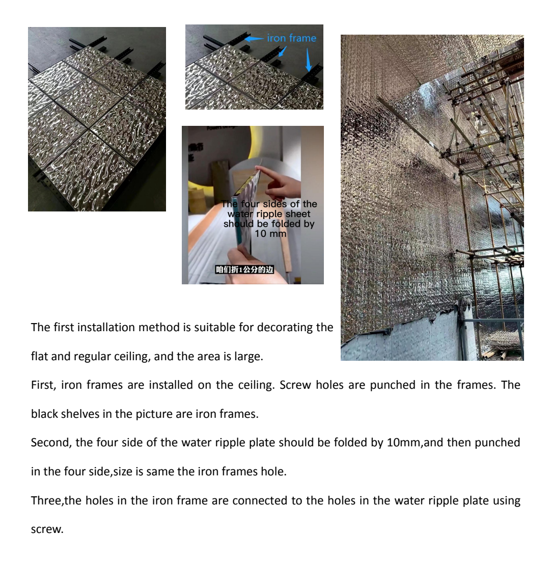 4.The four sides of the water ripple plate should be folded by 10mm,in order to be stuck in the reserved slot on the wood board. When splicing the plate,we should pay attention to the aligment and keep it beautiful.